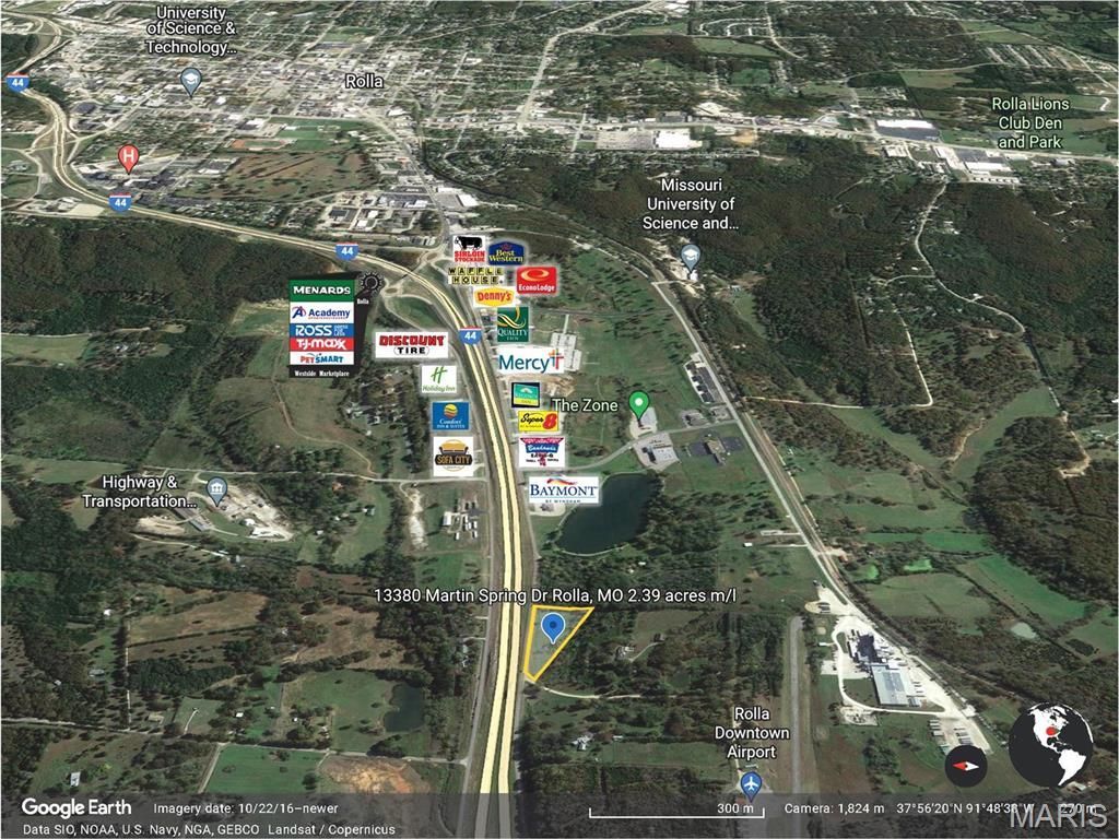 2.39 acres m/l with I44 visibility in the expanding west side on Rolla. Situated in the Rolla West Master Plan and proposed 5th Rolla exit this parcel is well poised to perform in the future. This parcel is located across the highway to the incoming VA clinic. Close to Mercy Clinic, Rolla Airport, and more! This site has many potential uses and is ready for development. Electric and sewer are available at site. Location: Hwy/Interstate Frntg
